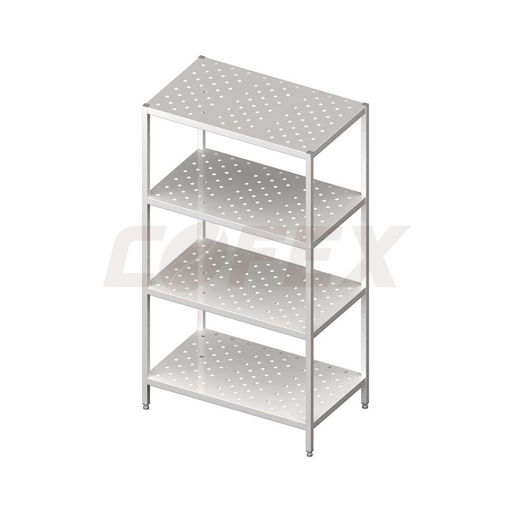 Regál montovateľný – perforované police 800x600mm - základná výška 1800 mm, nosnosť 70 kg/polica, nastaviteľná výška nožičiek + 25 mm - z nerezu AISI 445, rozmery: 800x600x1800 mm